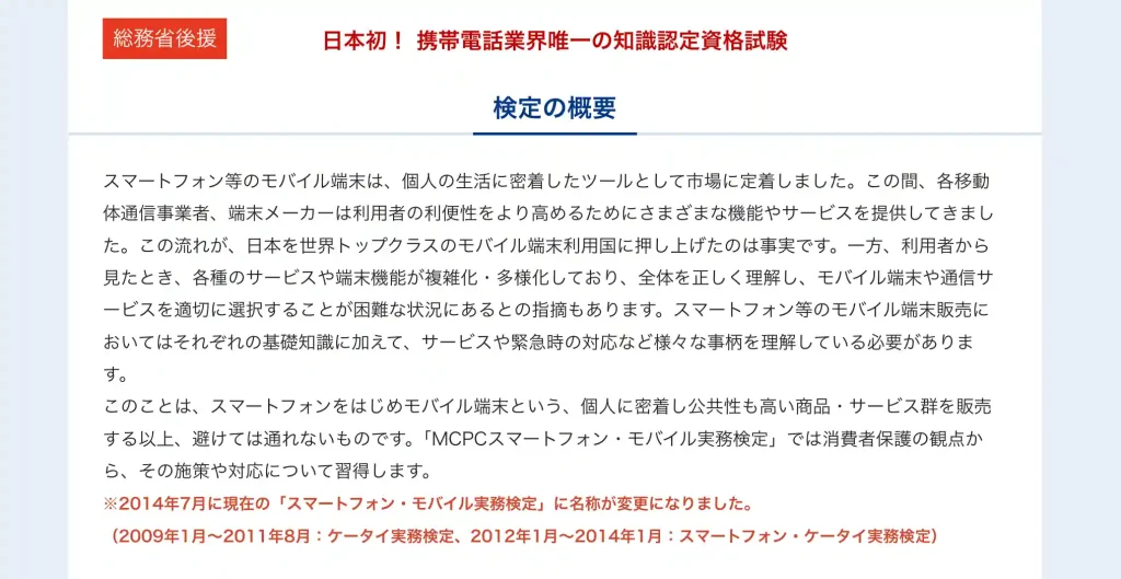 当資格は、総務省が後援する携帯電話業界で唯一の認定資格試験です。